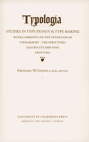 This electronic version of Goudy's Typologia is reproduced by permission of the University of California Press. While this online, interactive version is a useful reference work for typographers and typesetters, it does not compare with reading the actual book, which is available in paperback (ISBN 0520-03278-0), and printed in Goudy's own "University of California Old Style" fount, set with unique ligatures, and laid out by Goudy himself. Get more "Typologia" Order Information.